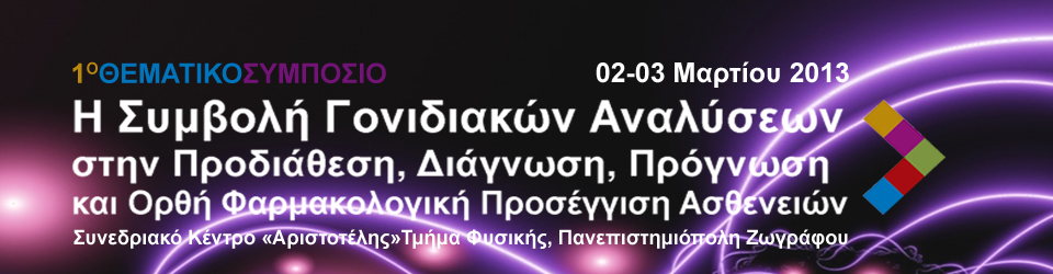 Μετά από μια πορεία πλέον των 10 ετών στην έρευνα στο Φαρμακευτικό Τμήμα του Εθνικού και Καποδιστριακού Πανεπιστημίου Αθηνών, έχω τη μεγάλη χαρά και την ιδιαίτερη τιμή να σας προσκαλέσω στο 1ο Θεματικό Συμπόσιο με τίτλο «Η Συμβολή Γονιδιακών Αναλύσεων στην Προδιάθεση, Διάγνωση Πρόγνωση και Ορθή Φαρμακολογική Προσέγγιση Ασθενειών», που θα πραγματοποιηθεί στις 02-03 Μαρτίου 2013 στο Συνεδριακό Κέντρο «Αριστοτέλης» του Τμήματος Φυσικής στην Πανεπιστημιόπολη Ζωγράφου.